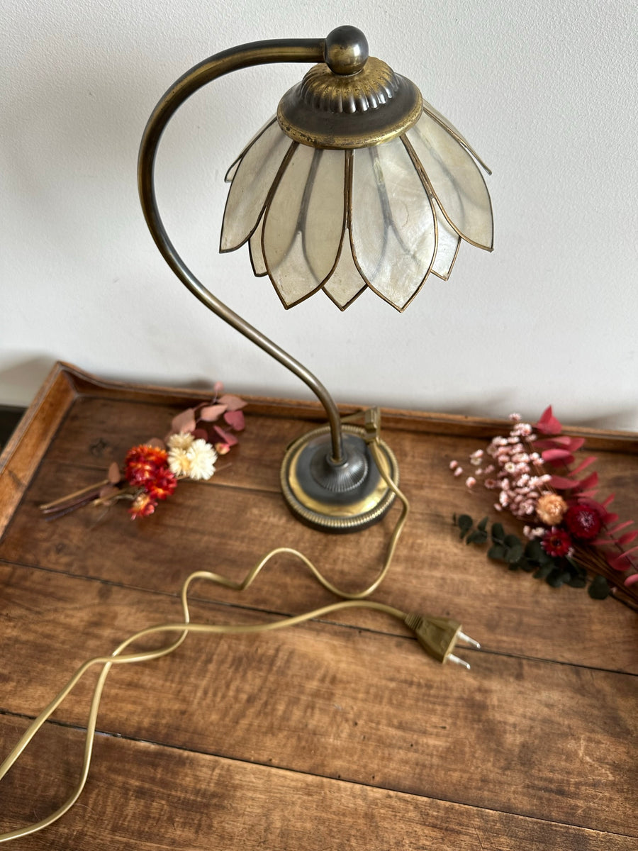 Charmante lampe datant des années 60 avec son joli abat-jour en nacre. On aime particulièrement la jolie lumière qui s'en dégage.