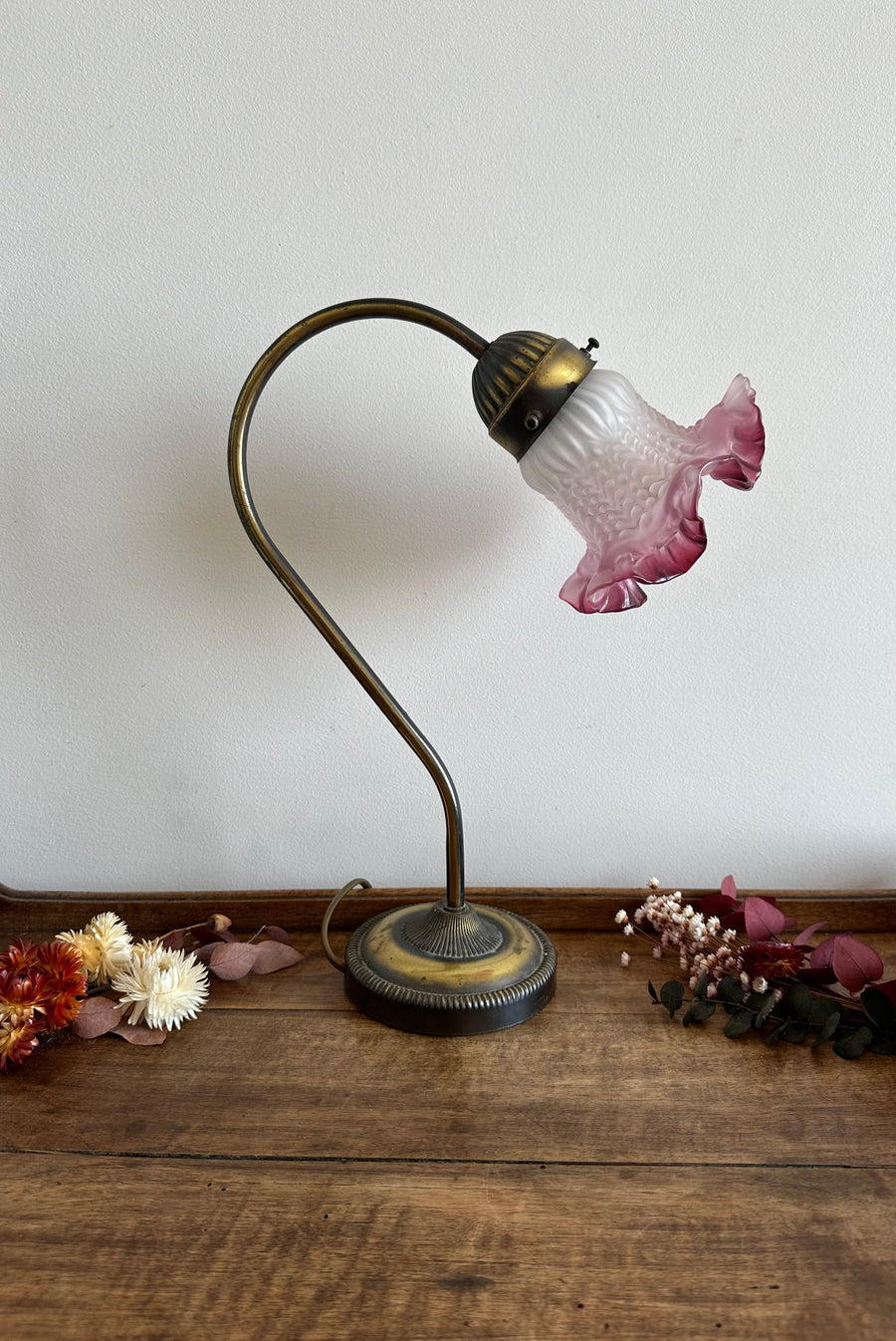 Jolie lampe en laiton dotée d'un globe tulipe rose violet. On aime sa structure mordorée et la jolie lumière qui s'en dégage. Estimation années 70-80. Attache un peu lâche au niveau du support du globe mais qui tient néanmoins solidement.