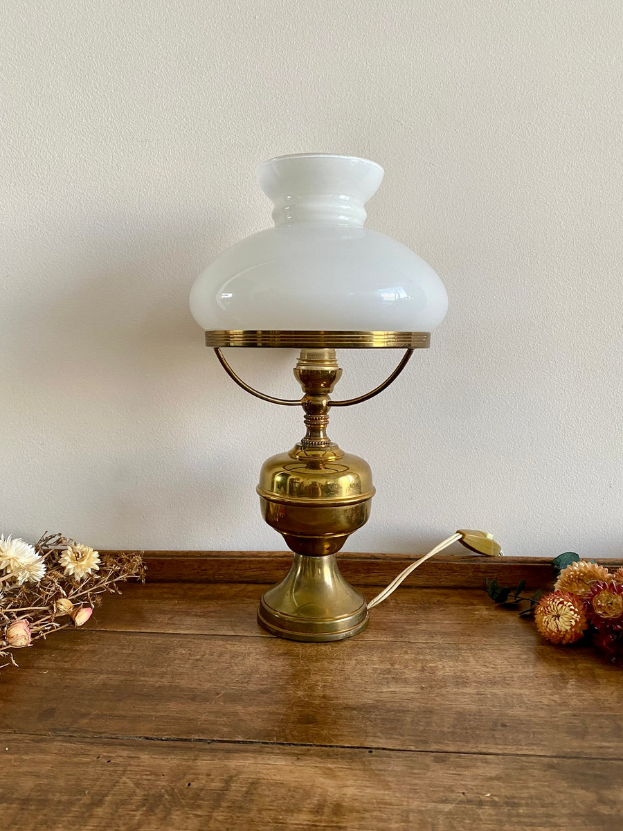 Belle lampe à poser en laiton doré doté d'un globe en opaline blanche. Une belle patine et de jolies traces du temps qui sont sublimées à l'éclairage ! Estimation années 70.
