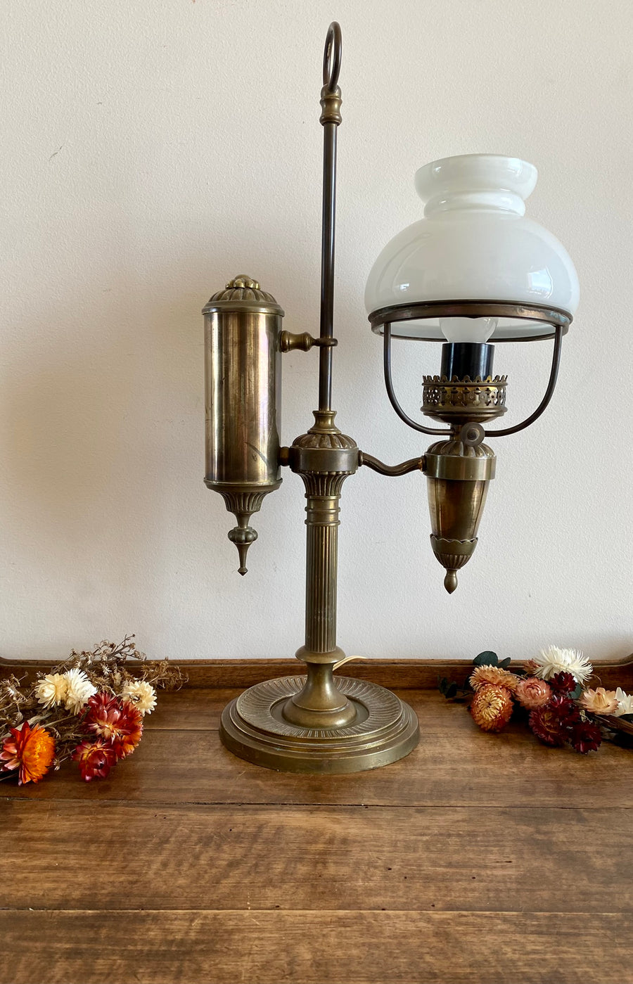 Lampe Quinquet du XIXème électrifiée avec globe en opaline blanche, piètement et réservoir en laiton.