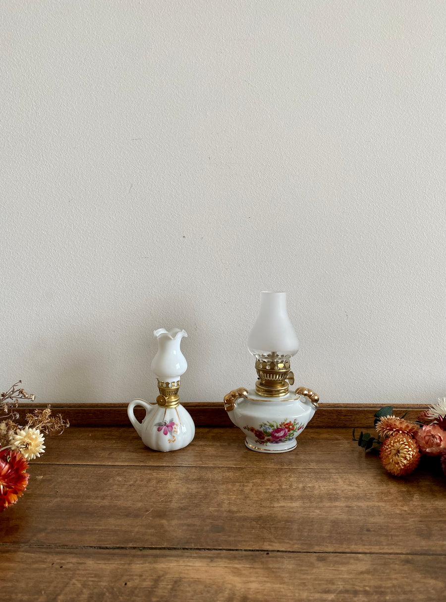 Adorables petites lampes à pétrole miniatures en porcelaine peinte. Vendues séparément.