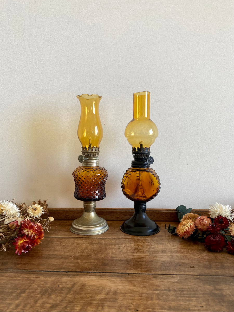 Lampes à pétrole en verre ambré avec socle en métal