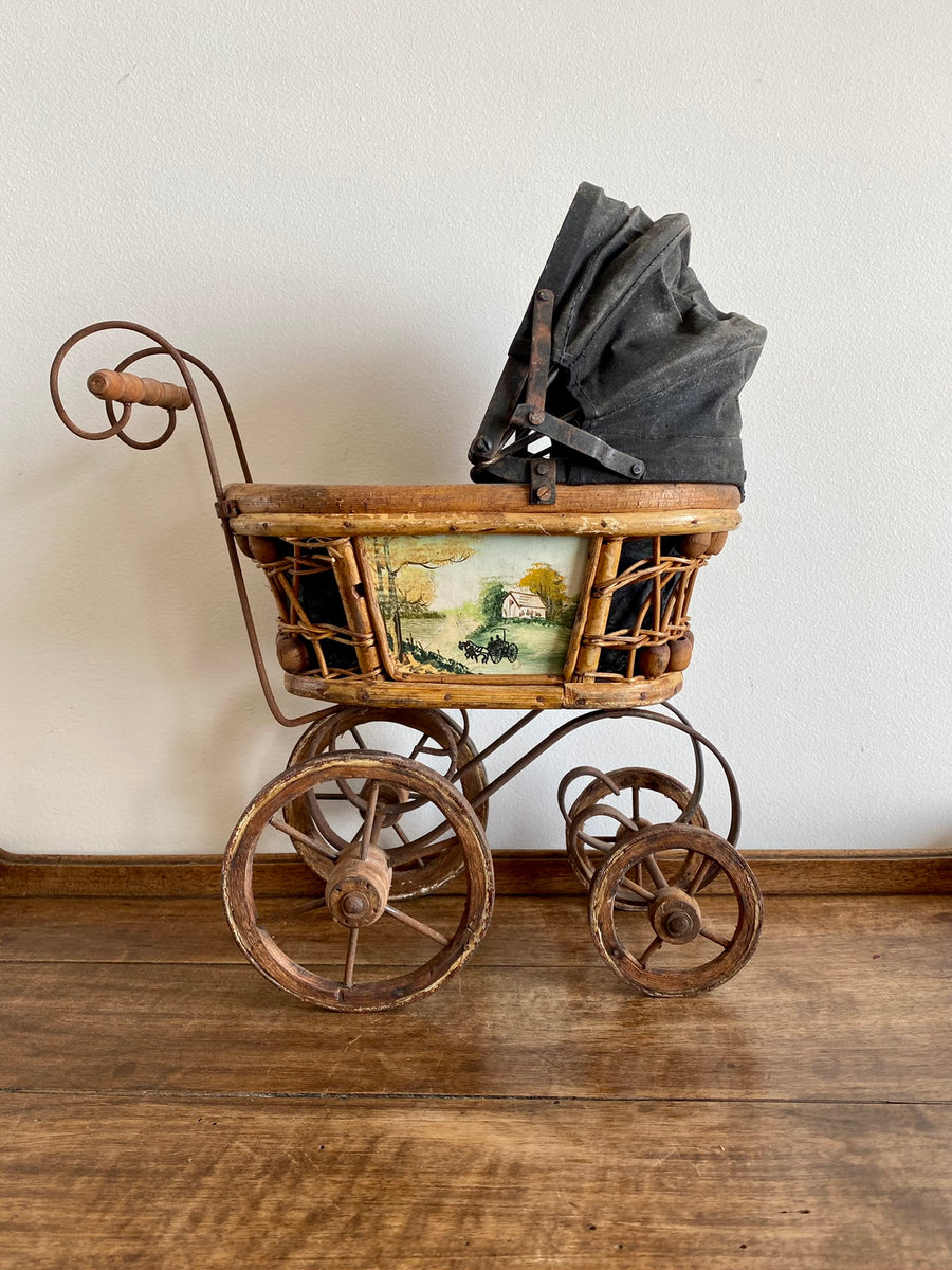 Adorable landau à poupées, en osier et bois. Estimation première moitié XXème