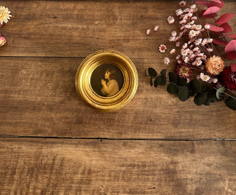 Adorable petit cadre en bois doré. Représentation de l'oeuvre de Sir Joshua Reynolds "Le Petit Samuel". Estimation 1950.