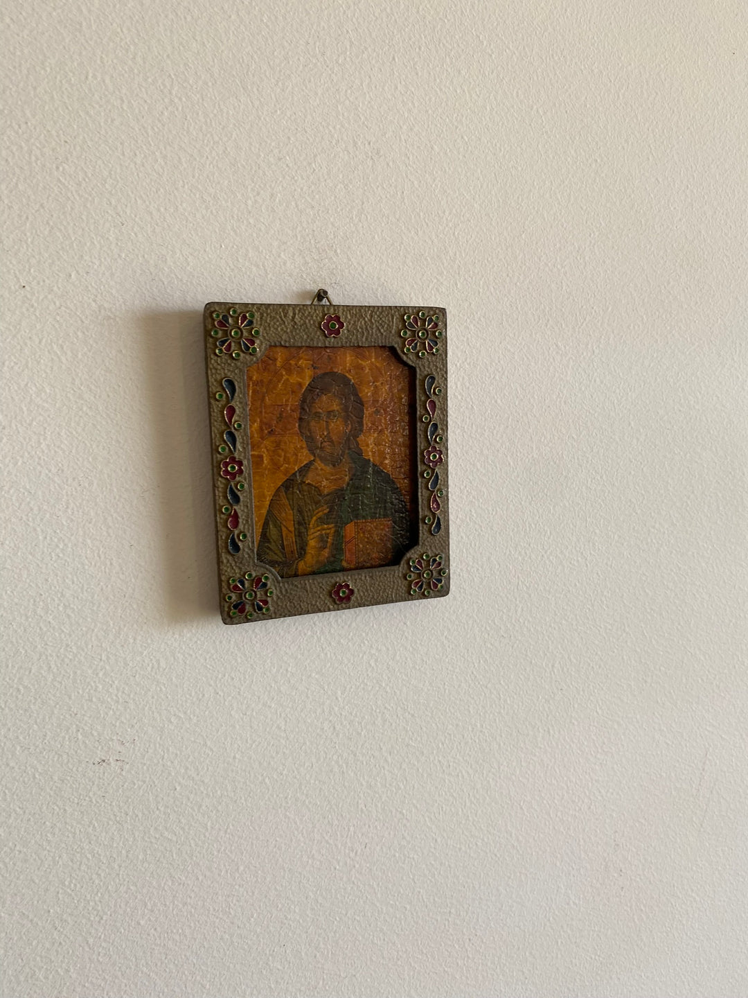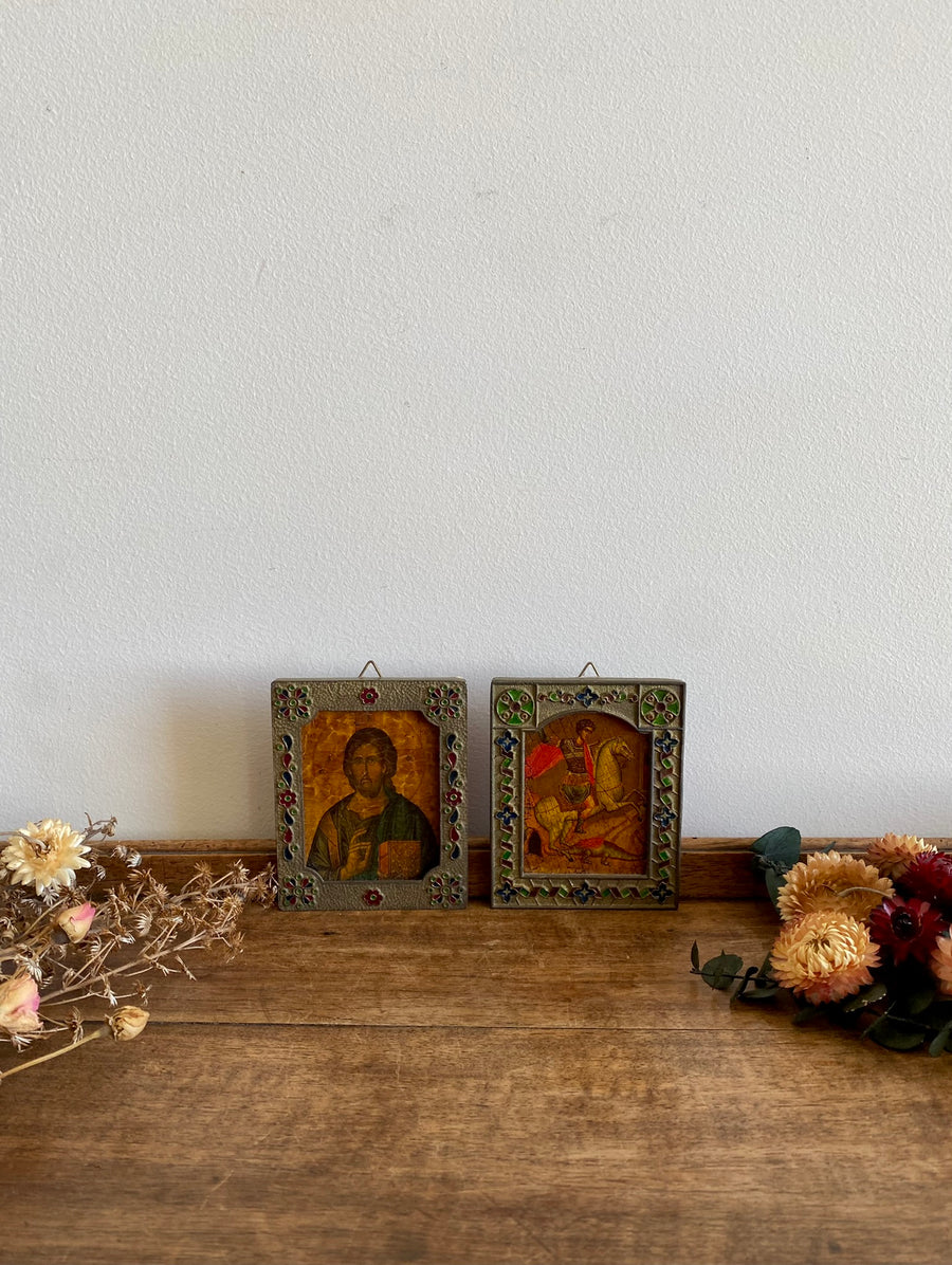 Ravissant duo de petites icônes religieuses dans leurs cadres en laiton sculpté.
