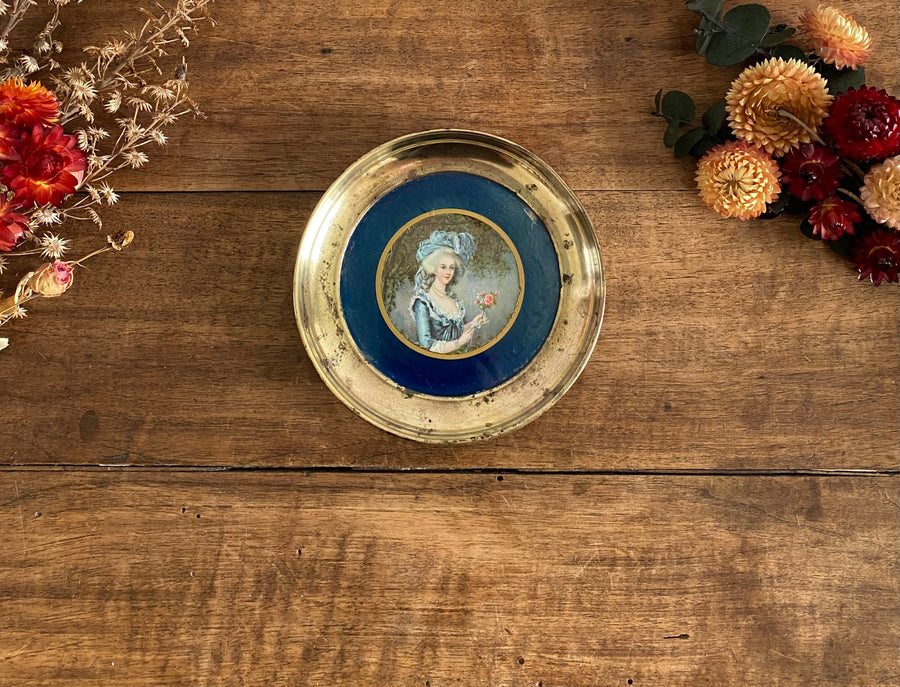 Ravissante coupelle en laiton avec en son centre une demoiselle en tenue d'époque. Belle patine. D'évidentes traces du temps visibles sur les photos. Pourra facilement être accrochée au mur en y ajoutant une accroche adhésive.