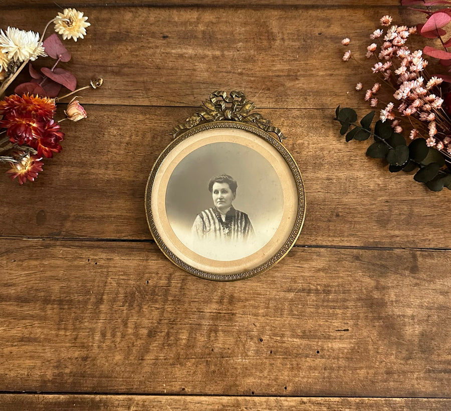 Joli médaillon photo à poser en laiton époque Napoléon III. On aime particulièrement son joli noeud travaillé. Vendu avec la photo d'origine que vous pourrez remplacer si vous le souhaitez. A noter, le cadre est légèrement en biais lorsqu'il est posé, il sera parfaitement droit si vous choisissez de l'accrocher au mur.