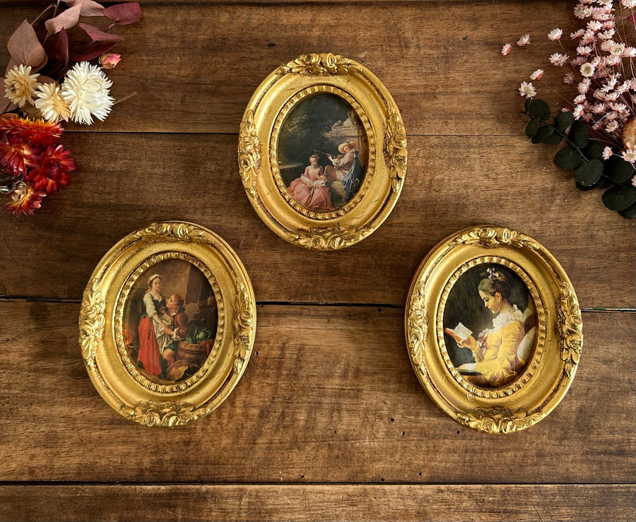 Charmant trio de scènes d"époque imprimées sur tissu dans leurs cadres dorés ovales épais.