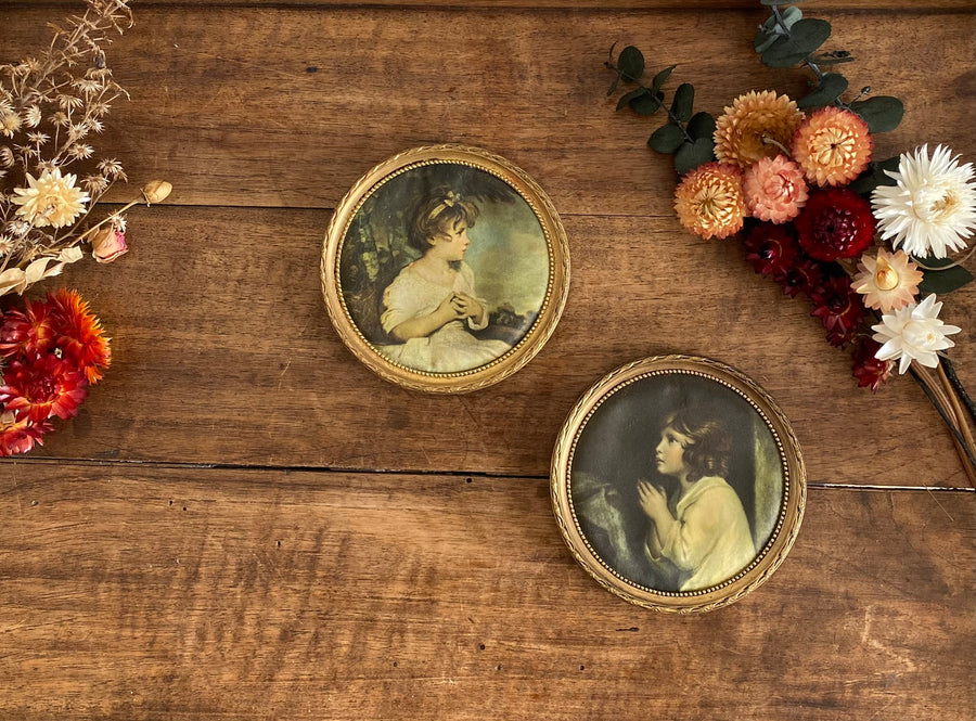 Joli duo de deux petites représentations sur soie des oeuvres de Reynolds dans leurs médaillons en métal doré. Vendus séparément.