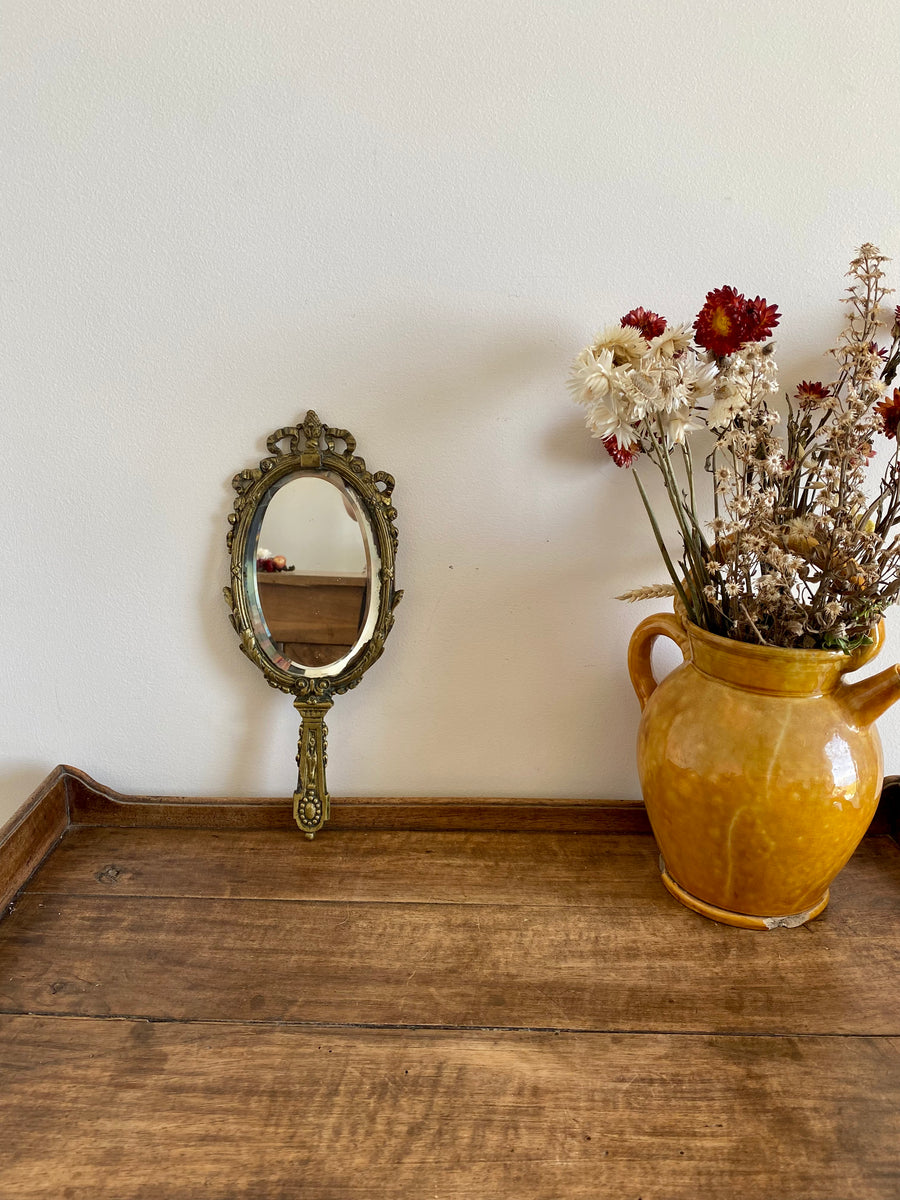 Sublime miroir à main en laiton ancien. Glace biseautée et plein d’imperfections, ce qui n’est évidemment pas pour nous déplaire ! Estimation fin XIXème.