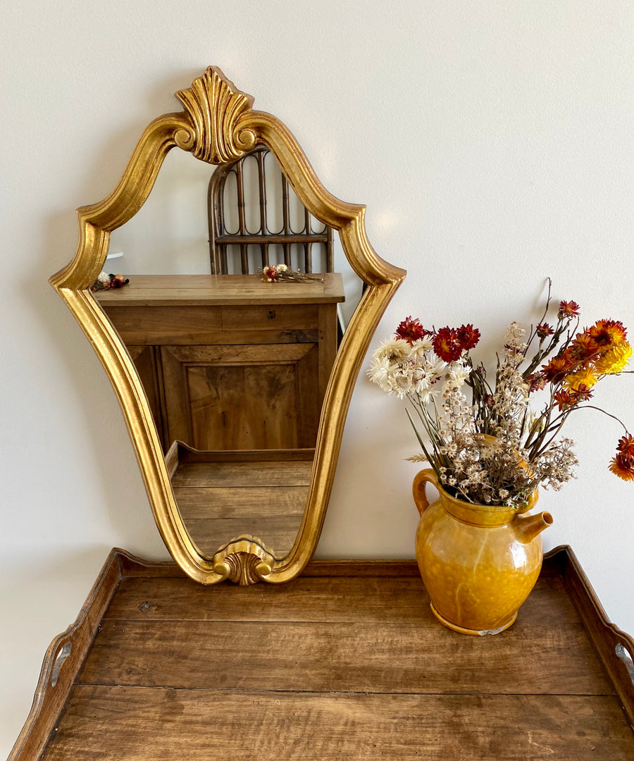 Joli miroir en résine, années 90, aux formes chantournées et style rococo. Il est léger et sera un ajout parfaite à un accumulation murale.