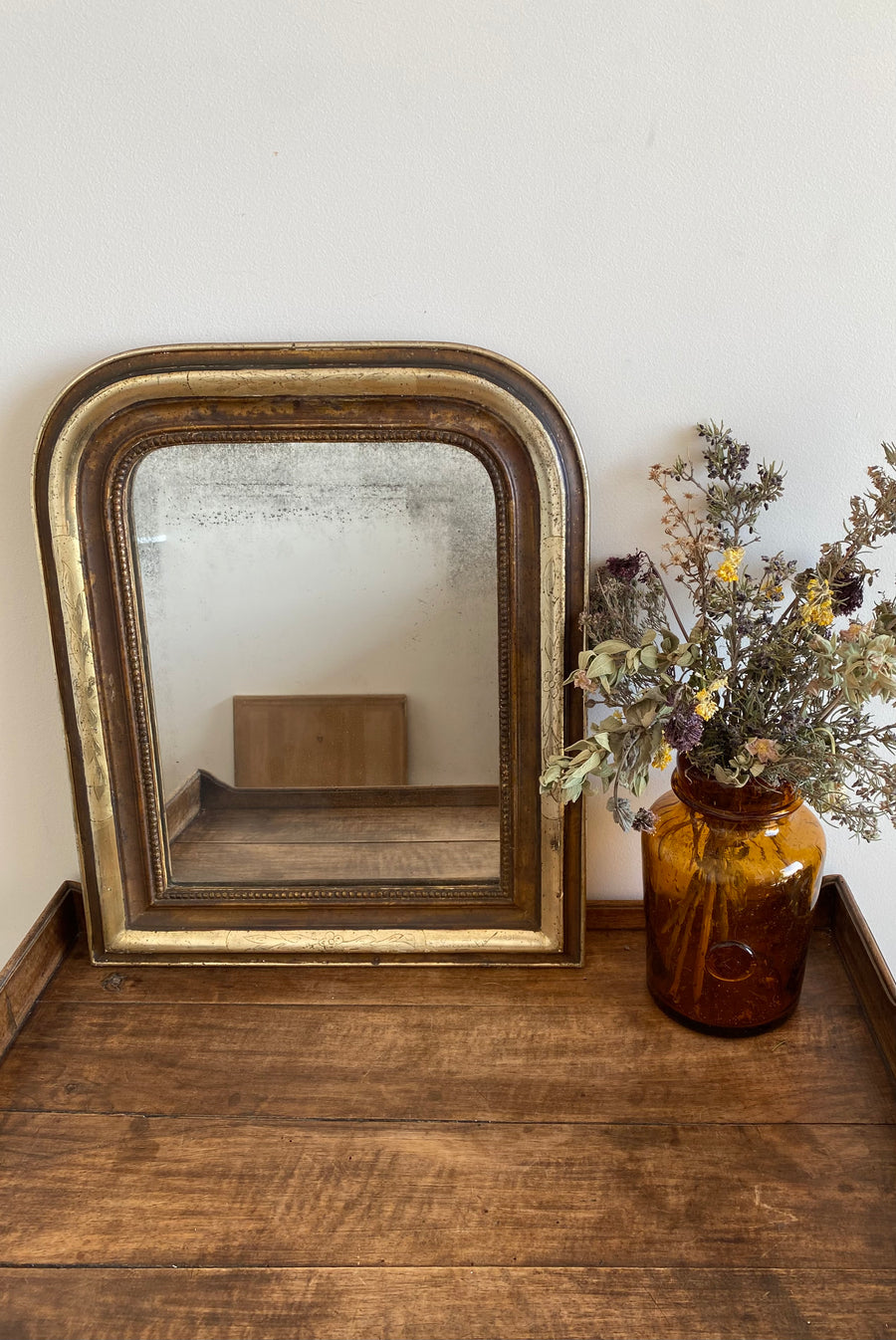 Beau miroir ancien style Louis Philippe, au mercure, en bois rehaussé de stuc.