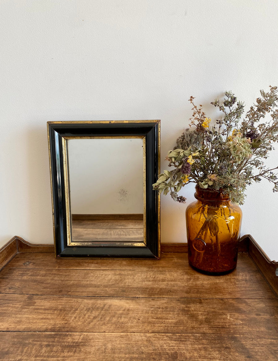 Beau miroir datant du début XXème siècle avec sa glace au mercure et son joli cadre en bois laqué noir et or.