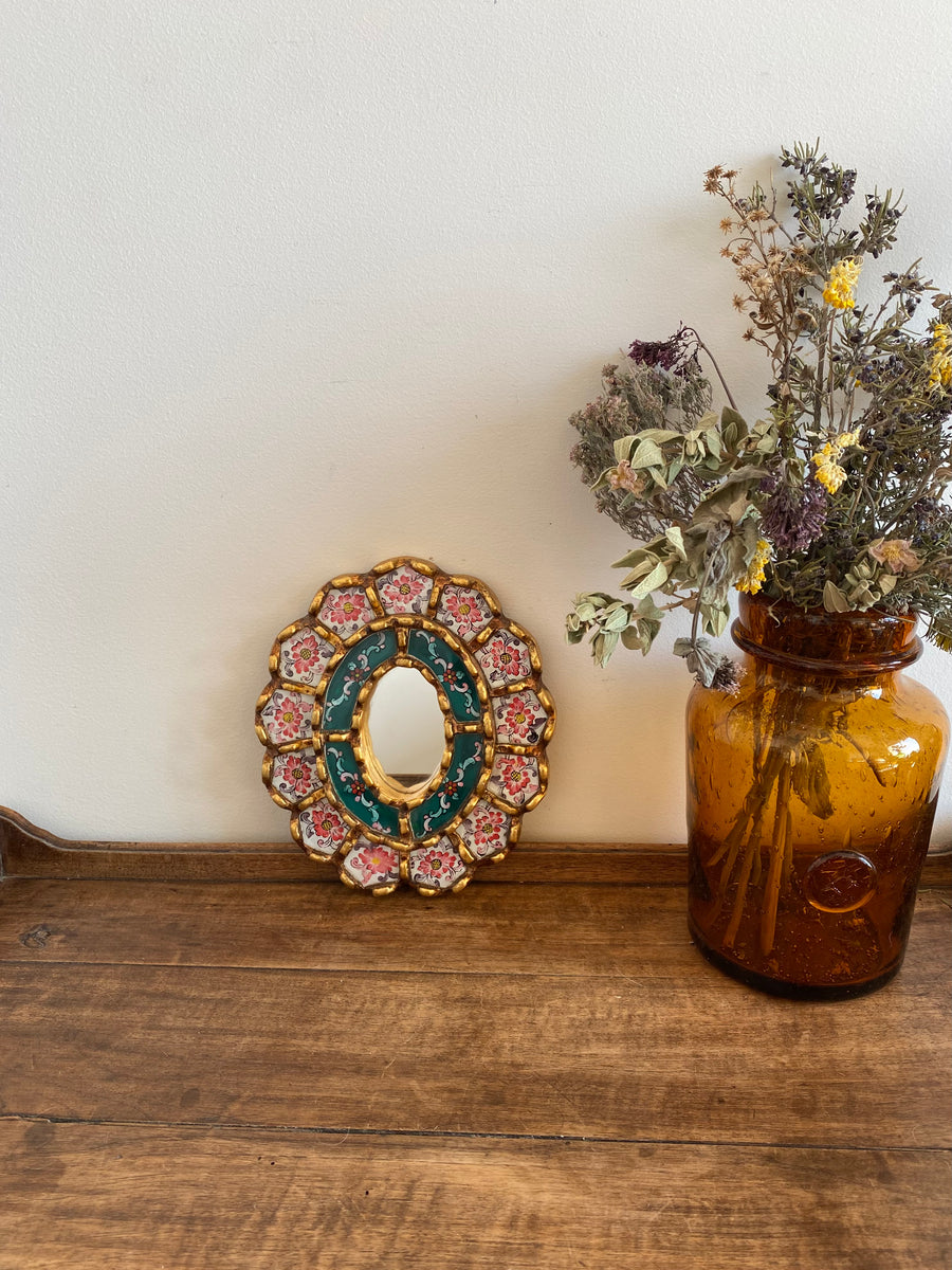 Alerte coup de cœur ! Voici un ravissant petit miroir artisanal péruvien vintage. Les facettes sont peintes à la main sous verre. On adore ses jolies couleurs printanières.