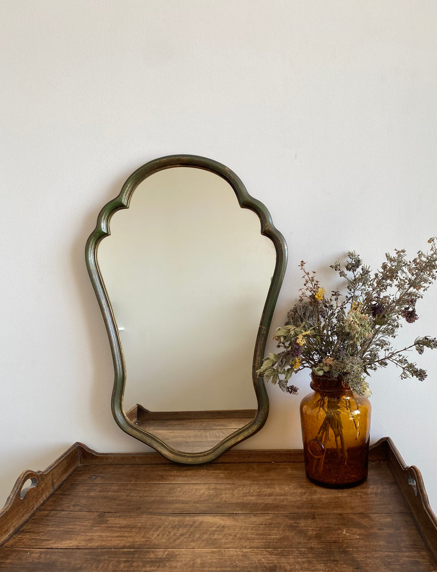 Élégant miroir en bois aux formes arrondies, aux couleurs vert bouteille et or.