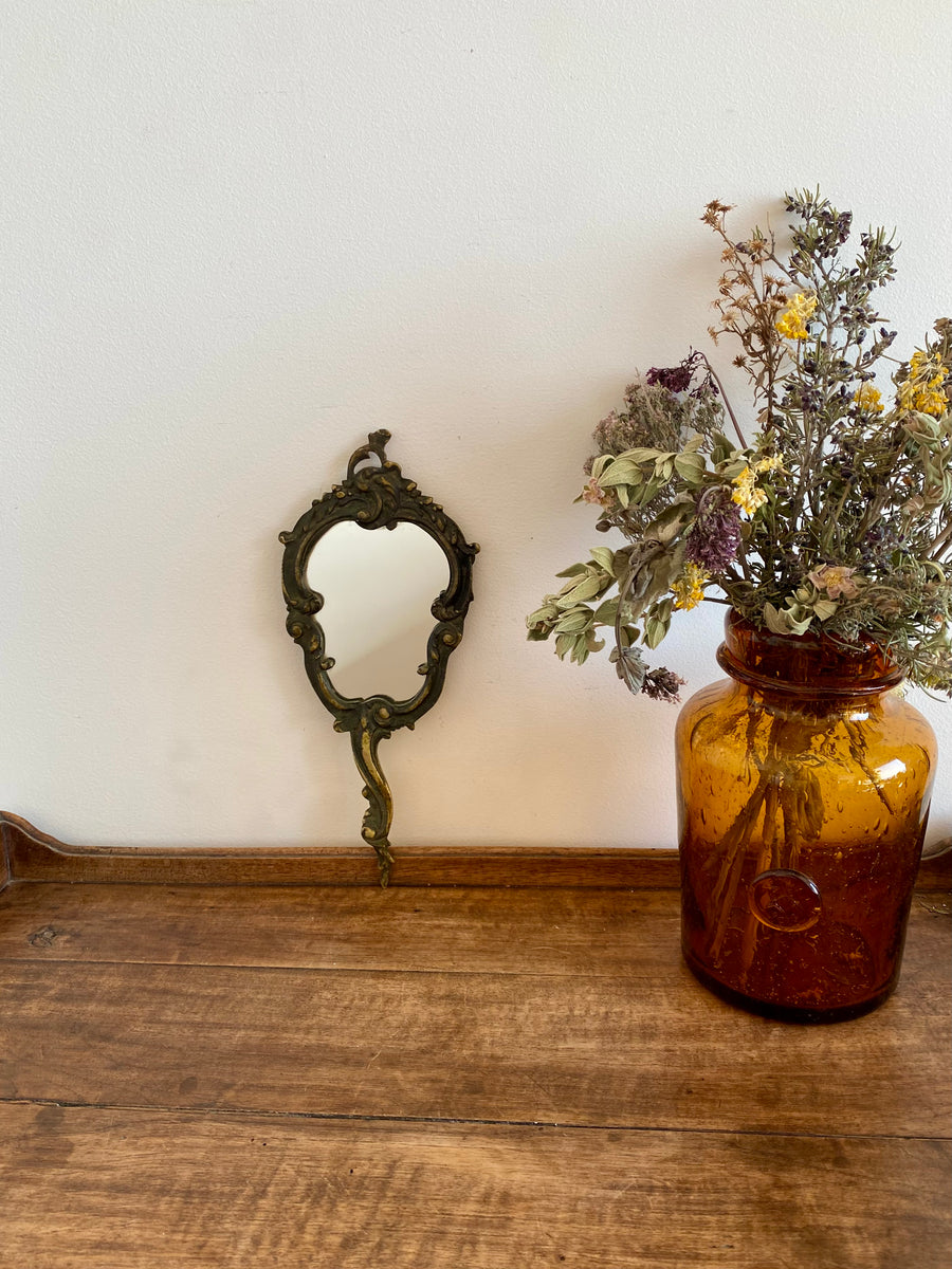 Très beau miroir à main ancien en régule doré, dans le style gothique.
