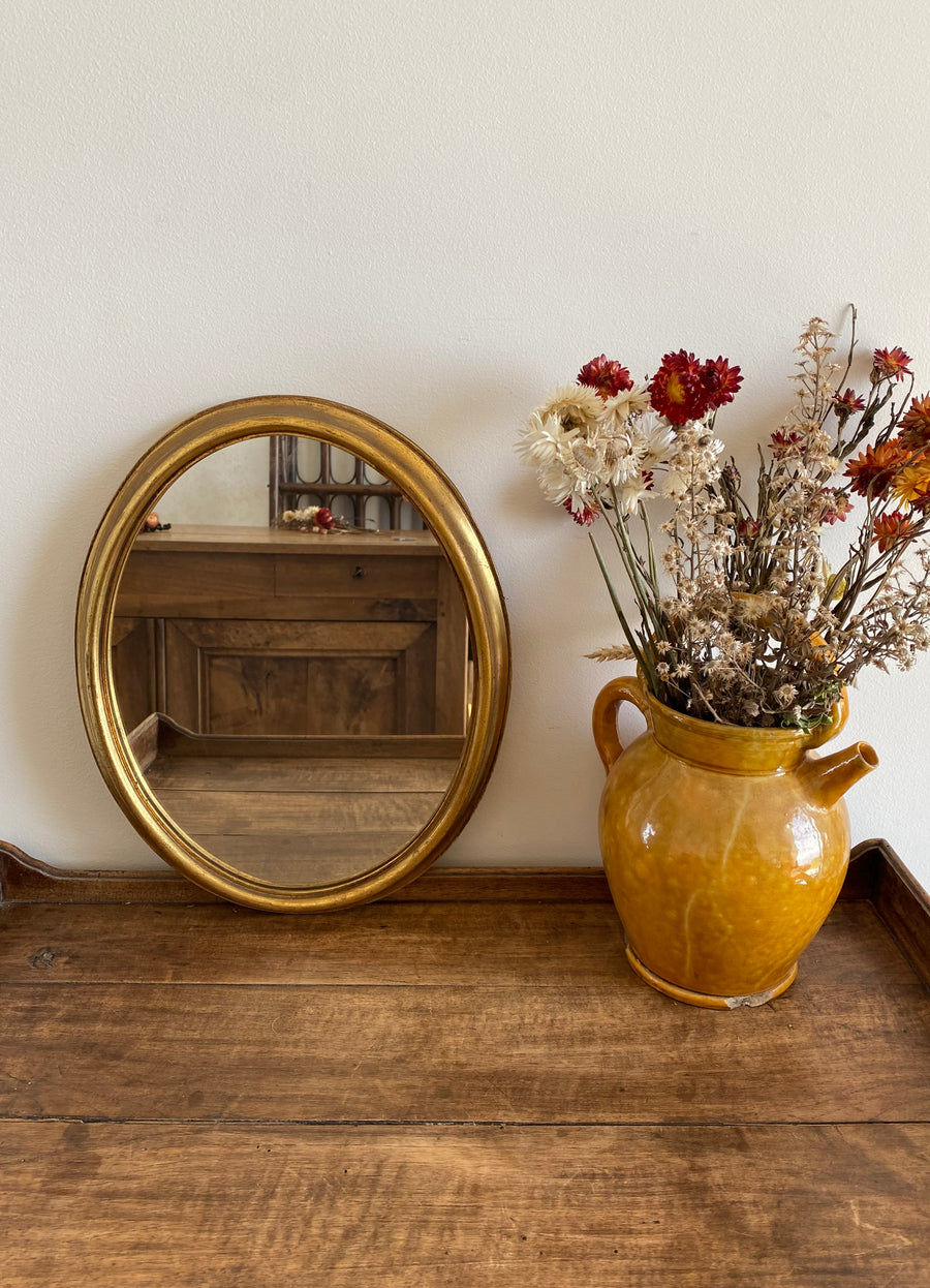 Ravissant miroir ovale ancien en bois doré. De jolies traces du temps mouchetées sur la vitre.