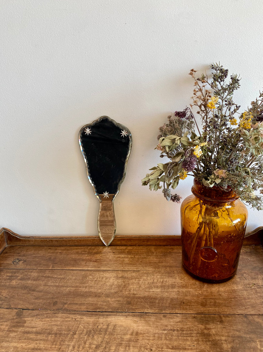 Beau miroir à main aux bords biseautés, gravé de petites étoiles et piqué par endroits ce qui lui donne un charme fou !
