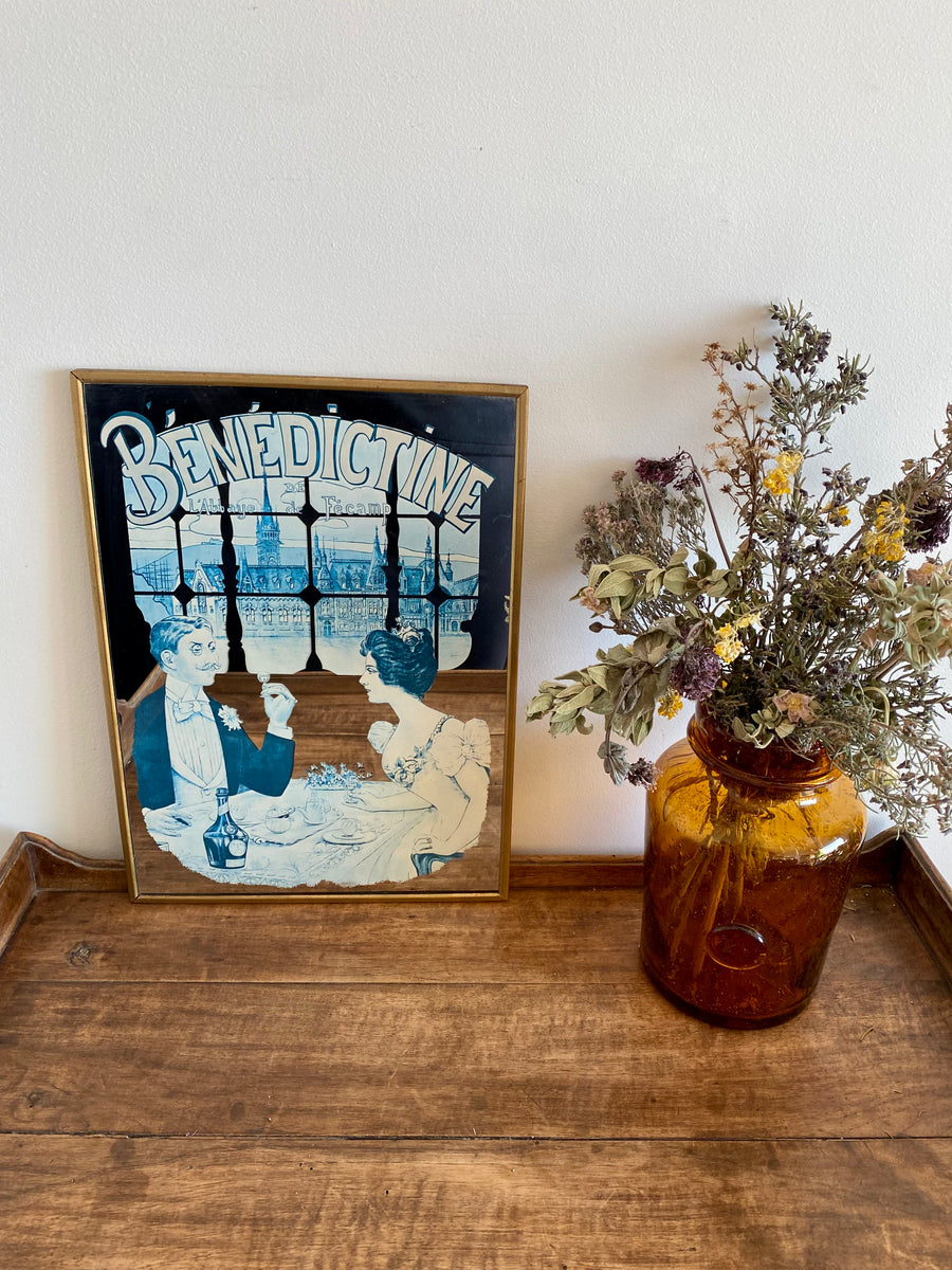 Miroir publicitaire Bénédictine de l'Abbaye de Fécamp dans les tons bleutés.