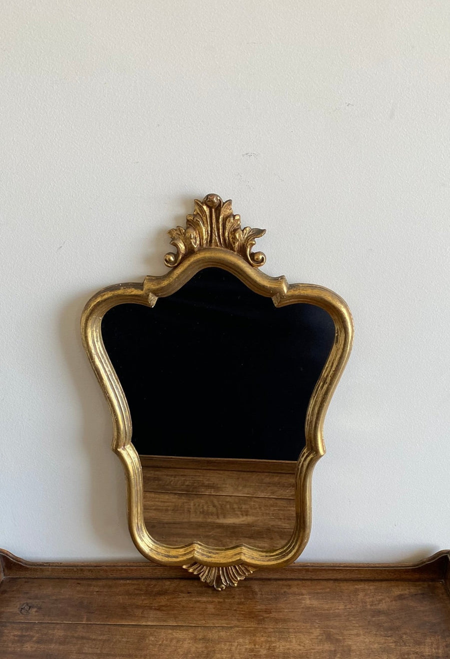 Beau miroir vintage léger, plein de charmantes imperfections avec son joli fronton style baroque travaillé.