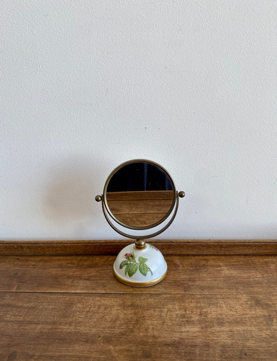 Adorable petit miroir sur pied en porcelaine peinte à la main. Cerclé de laiton. Un côté grossissant.  Glace rotative.