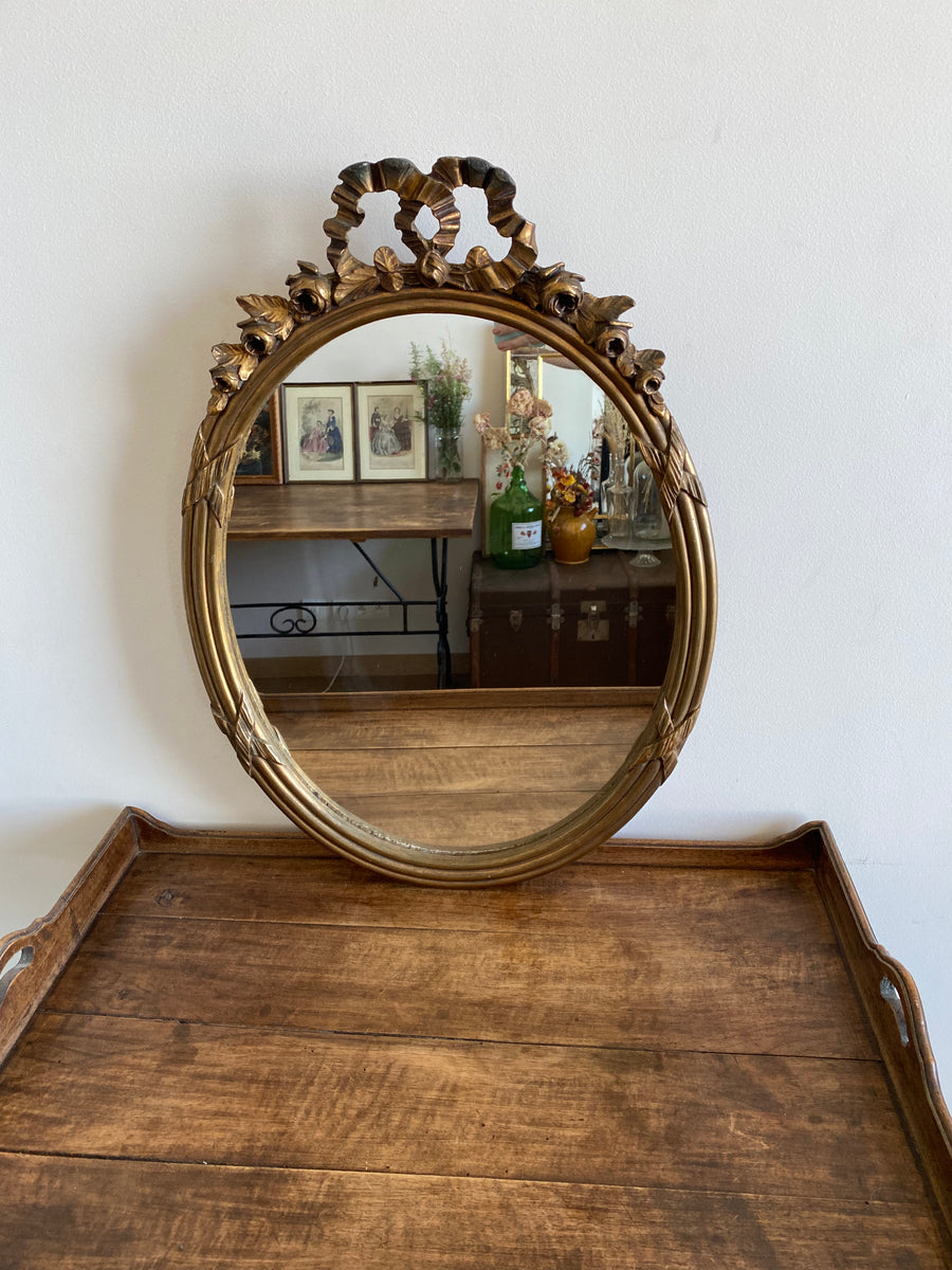 Sublime miroir ovale aux nuances mordorées et son fronton composé de roses sculptées et d'un noeud travaillé.
