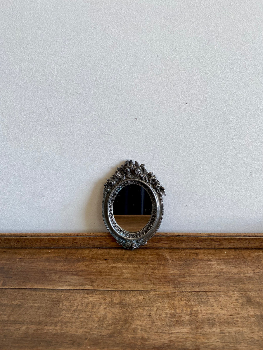 Charmant petit miroir en métal argenté orné de petites roses sculptées.
