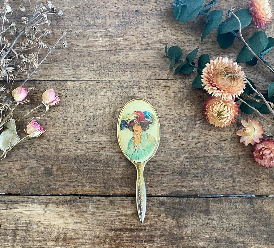 Adorable petit miroir à main taille XS, au dos, une élégante dame et son chapeau à plume