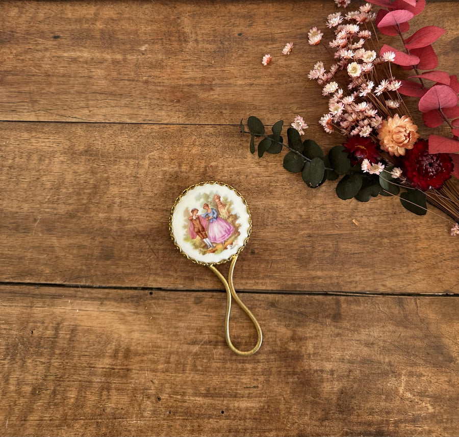 Ravissant petit miroir à main en porcelaine de Limoges avec son armature dorée. Taille XS
