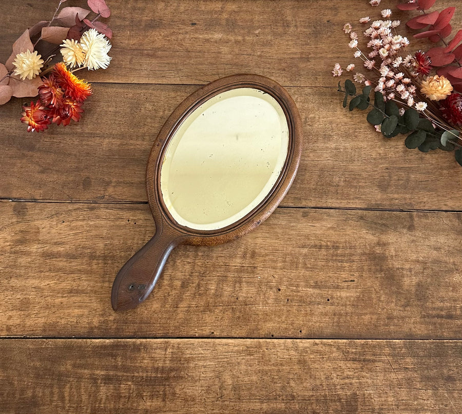 Adorable miroir à main biseauté recouvert de cuir. De jolies traces du temps qui lui rajoutent du charme.