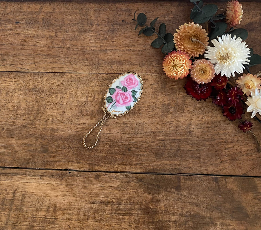 Irrésistible petit miroir à main en laiton dentelé. Porcelaine de limoges peinte à la main