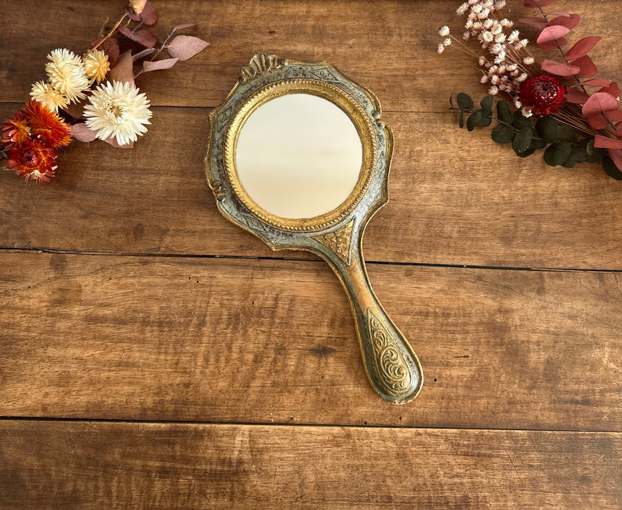 Coup de coeur pour ce joli miroir en résine, bois et stuc de style florentin. Objet résolument imparfait comme on les aime. On aime particulièrement sa patine et ses jolis tons verts et or. Estimation années 60.