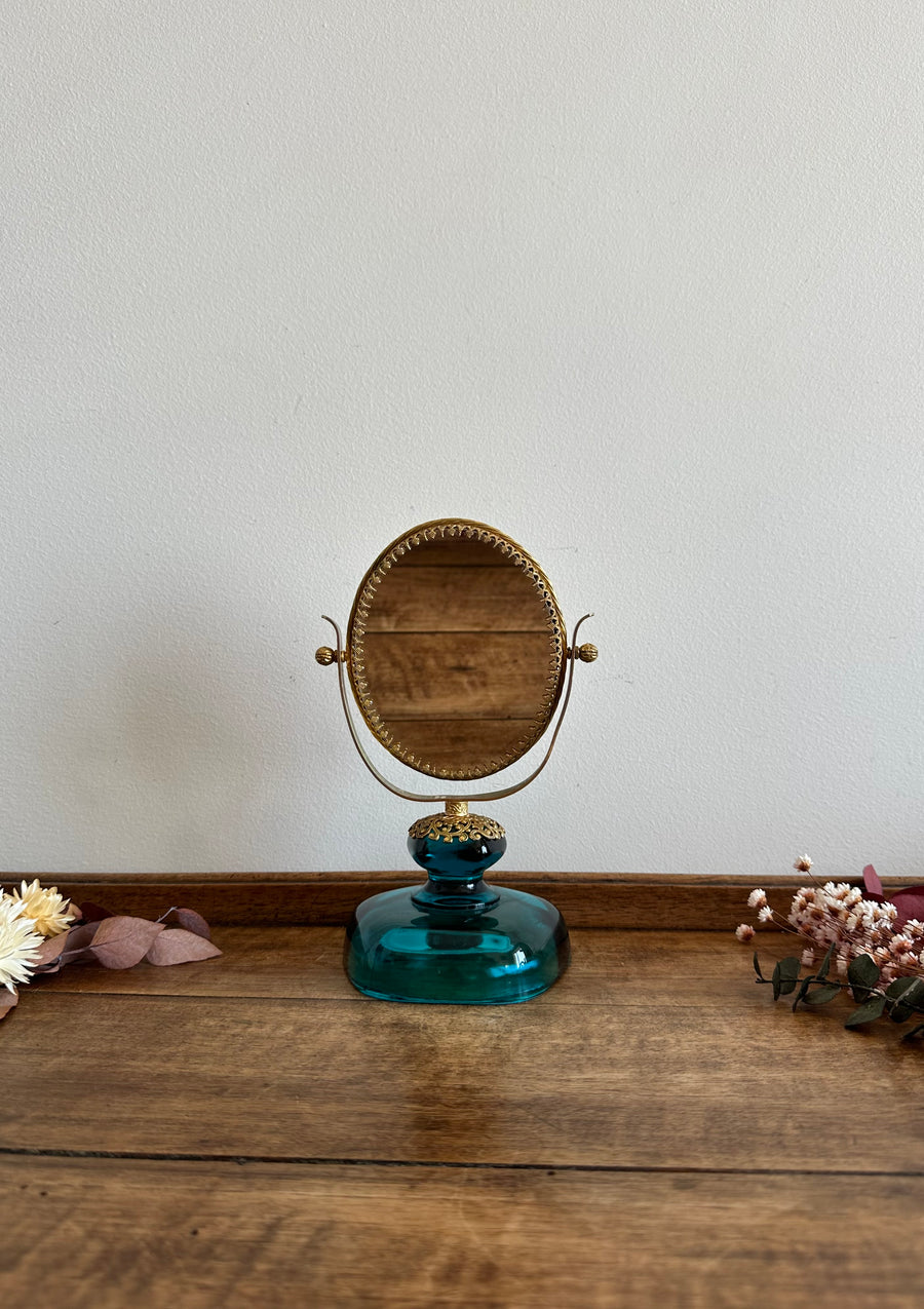 Miroir à poser en laiton dentelé sur socle en verre bleu