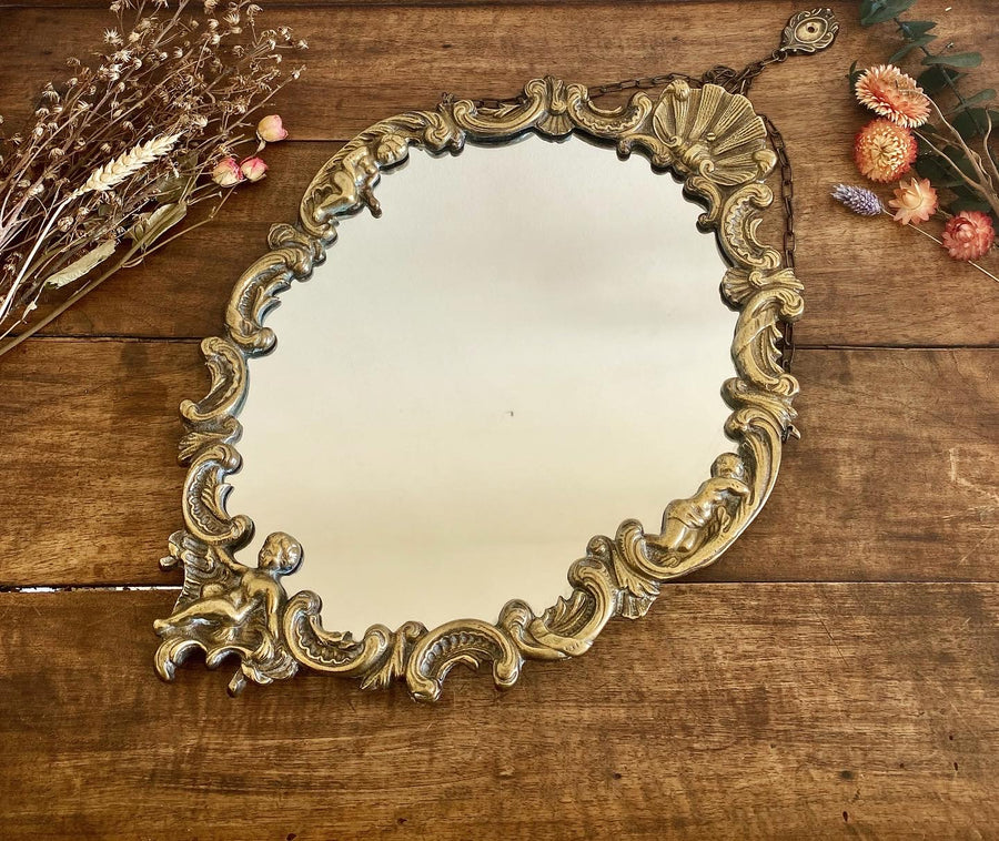 Joli miroir en bronze à l'esprit Rococo qu’on aime tant. Il comporte une petite chaînette qui permettra de l’accrocher où bon vous semble pour un joli effet kitsch