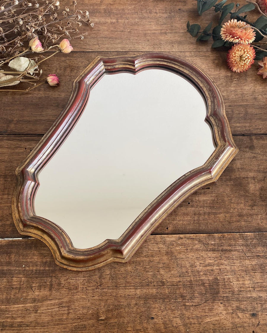 Joli petit miroir aux formes chantournées en bois doré sobre et élégant