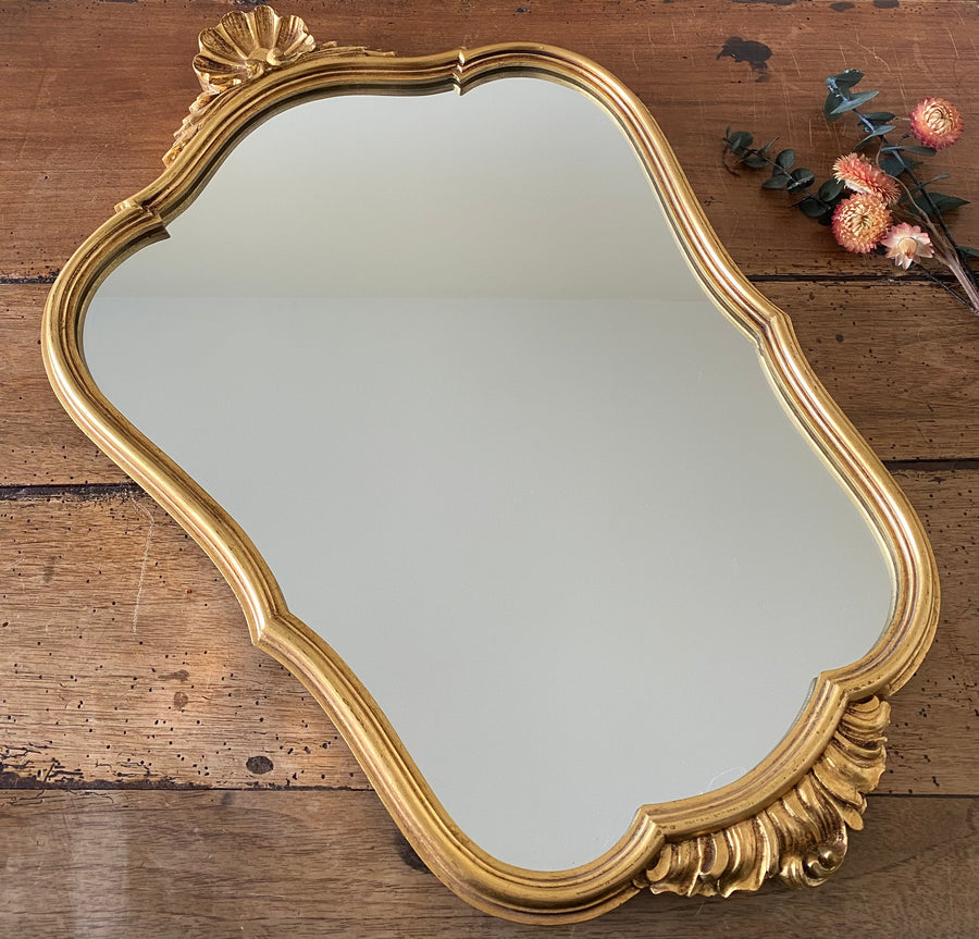 Sublime miroir en bois doré avec ses jolies courbes et son fronton coquillage