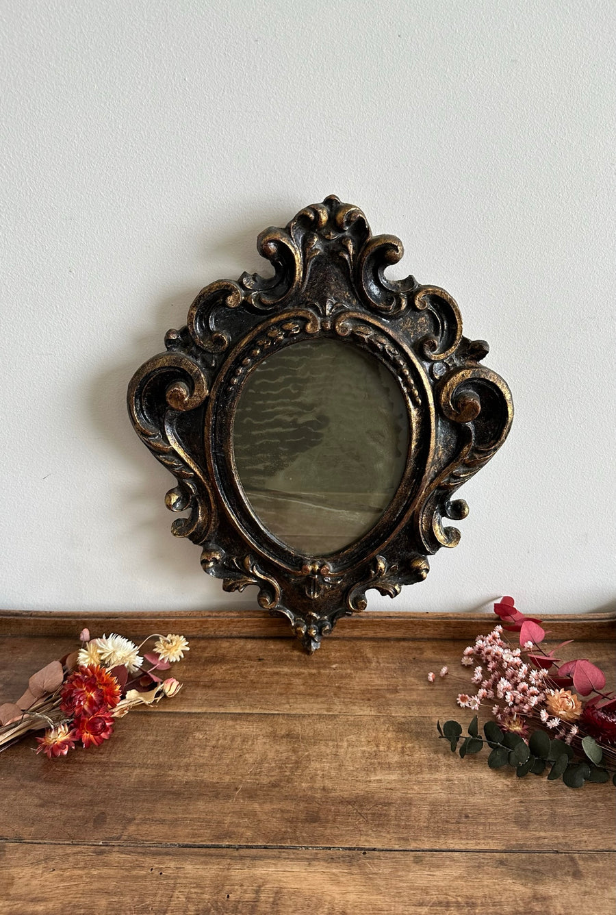 Superbe miroir florentin en bois aux tons noir et or. Se mélange à merveille à une accumulation murale, mais aussi en pièce de déco centrale. Miroir ancien à l'aspect voilé, probablement au mercure. Estimation début 20ème. A noter restauration ancienne visible sur l'une des moulures à l'arrière du cadre.