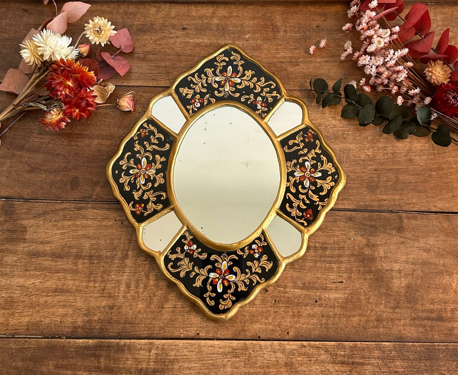 Coup de coeur pour ce joli miroir artisanal péruvien. Facettes aux tons noir et or rehaussés de touches de rouge. Miroir légèrement piqué par endroits visible sur les photos.
