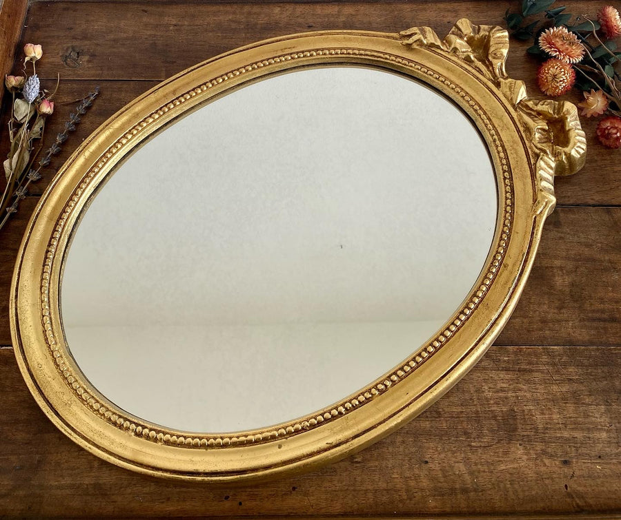 Ravissant miroir ovale en bois doré, style baroque avec nœud romantique et bordure intérieure perlée