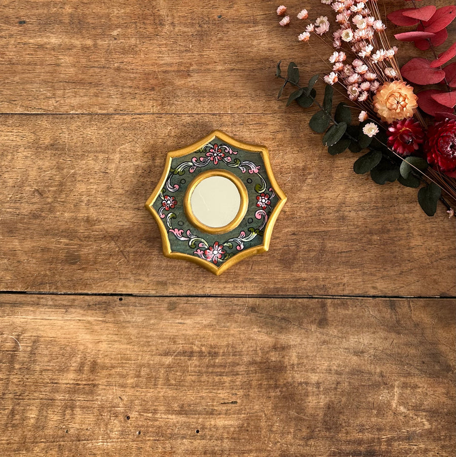 Adorable petit miroir péruvien octogonal aux tons verts réhaussés de doré.