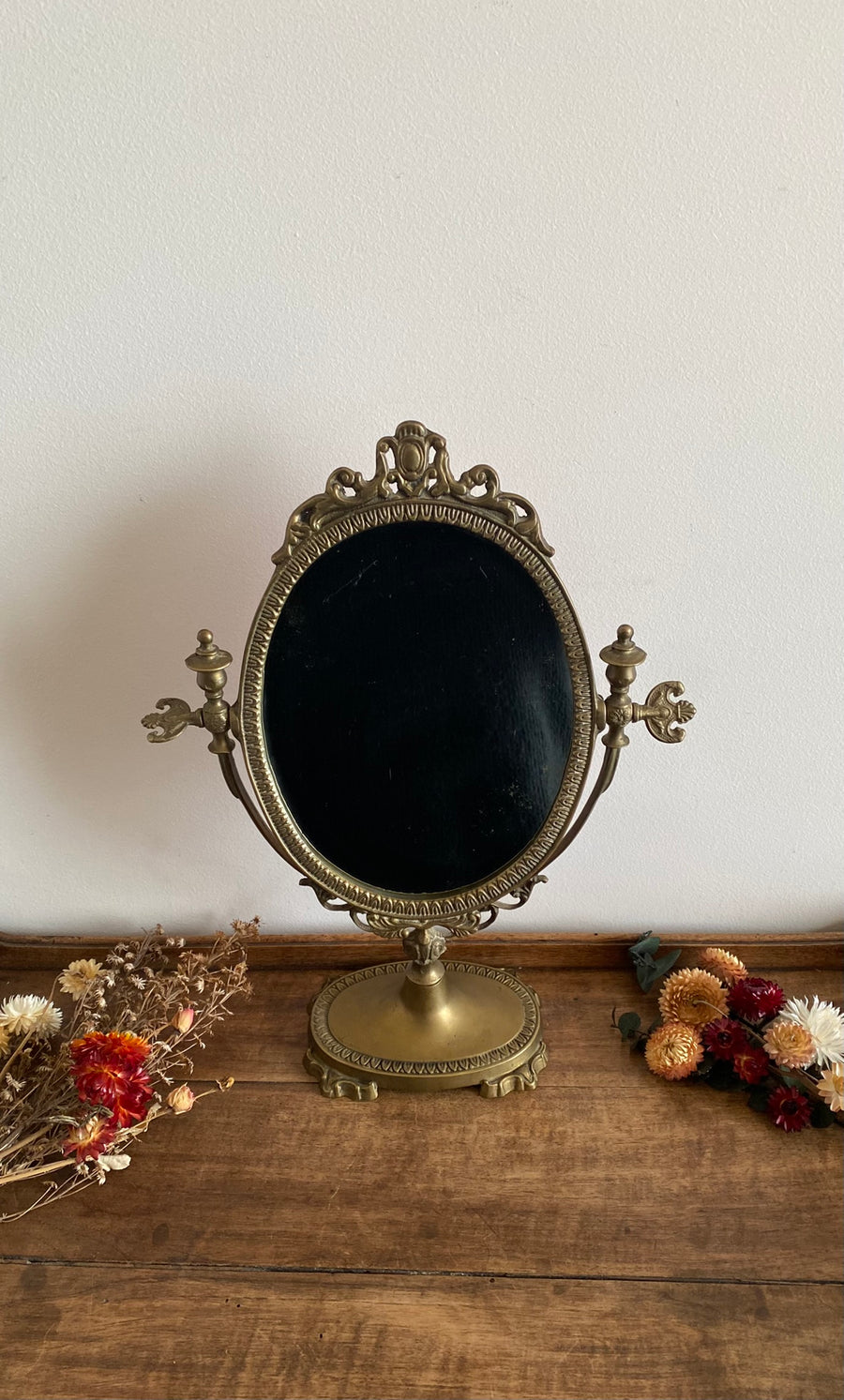 Beau miroir psyché en laiton vintage. Idéal en déco sur un meuble ou dans une salle de bain plus moderne.