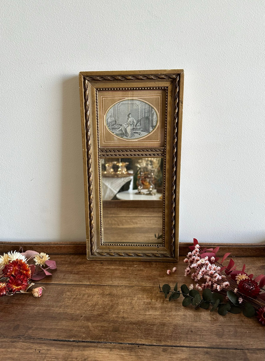 Joli petit miroir trumeau. Partie haute composé d'une petite scène d'époque intime. Cadre en bois et stuc doré. Estimation années 50