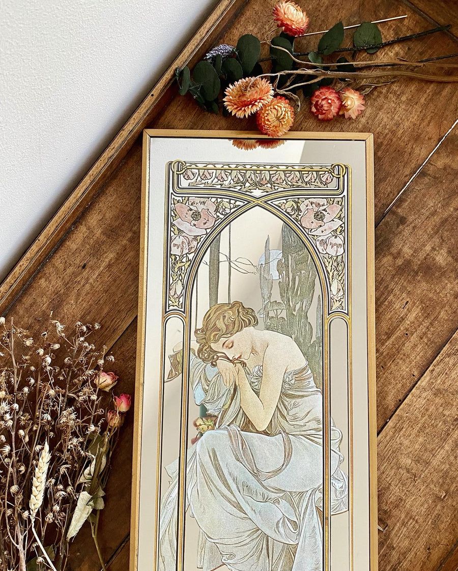 Joli cadre Miroir Vintage Art Nouveau dans les tons de gris et or représentation du célèbre “ Repos de la nuit”, de l’artiste Alphonse Mucha (1860-1939) datant des années 1970-1980