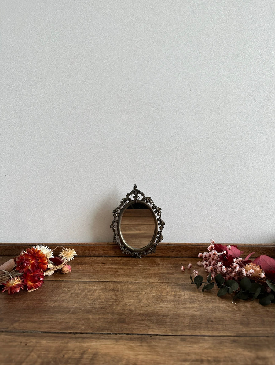 Adorable petit miroir format XS à l’armature ajourée en métal dentelé. Estimation années 60.