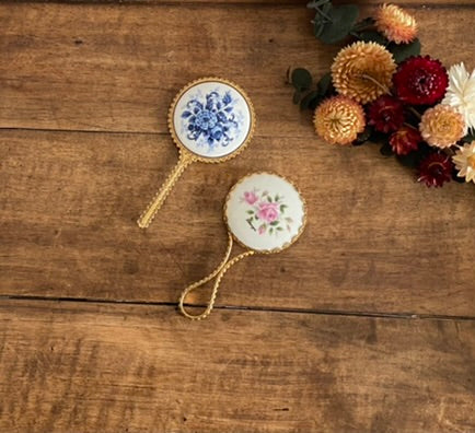Adorable lot de deux petits miroirs à main en porcelaine. Vendus séparément.