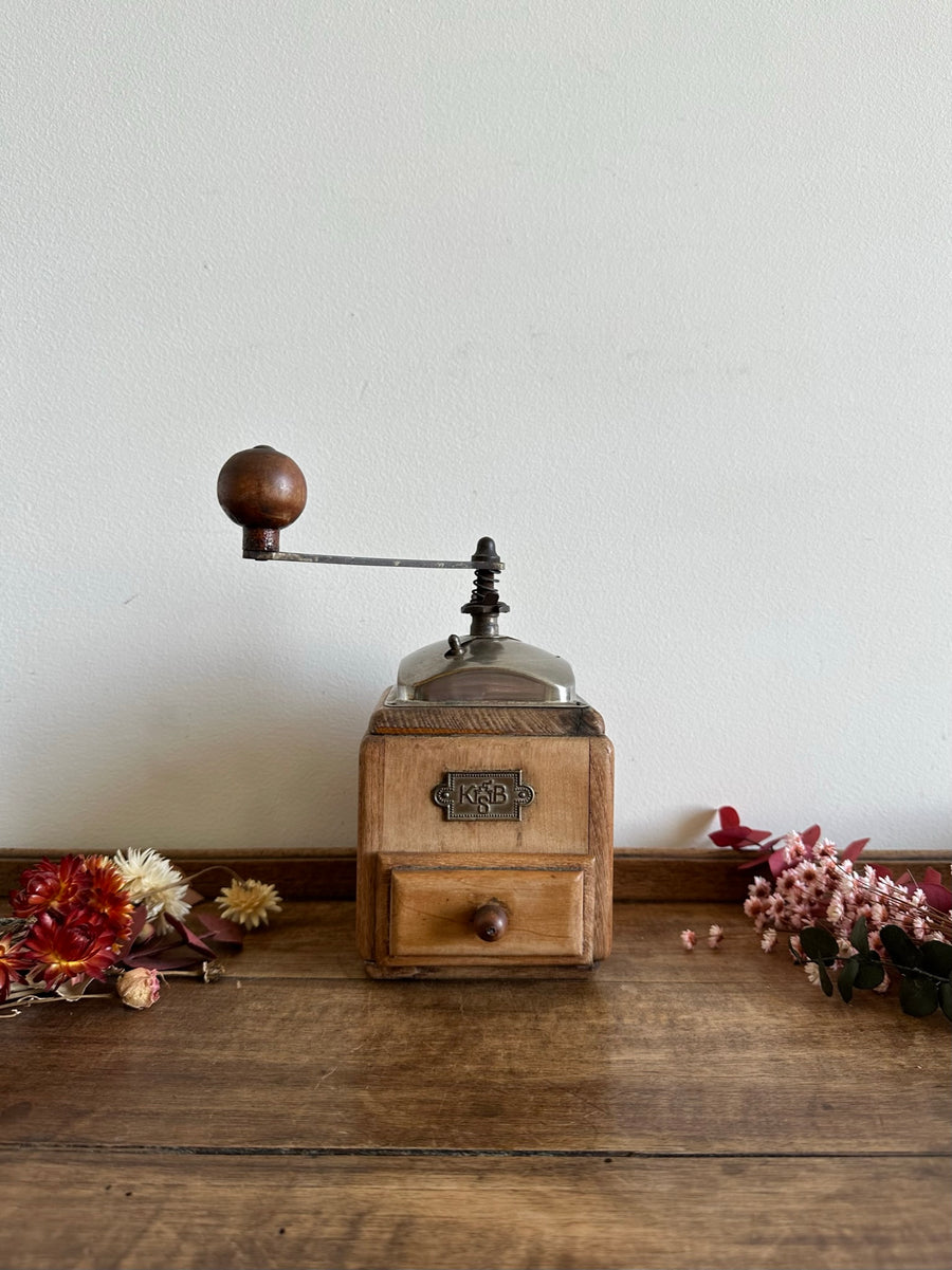 Joli petit moulin à café en bois naturel patiné signé KSB