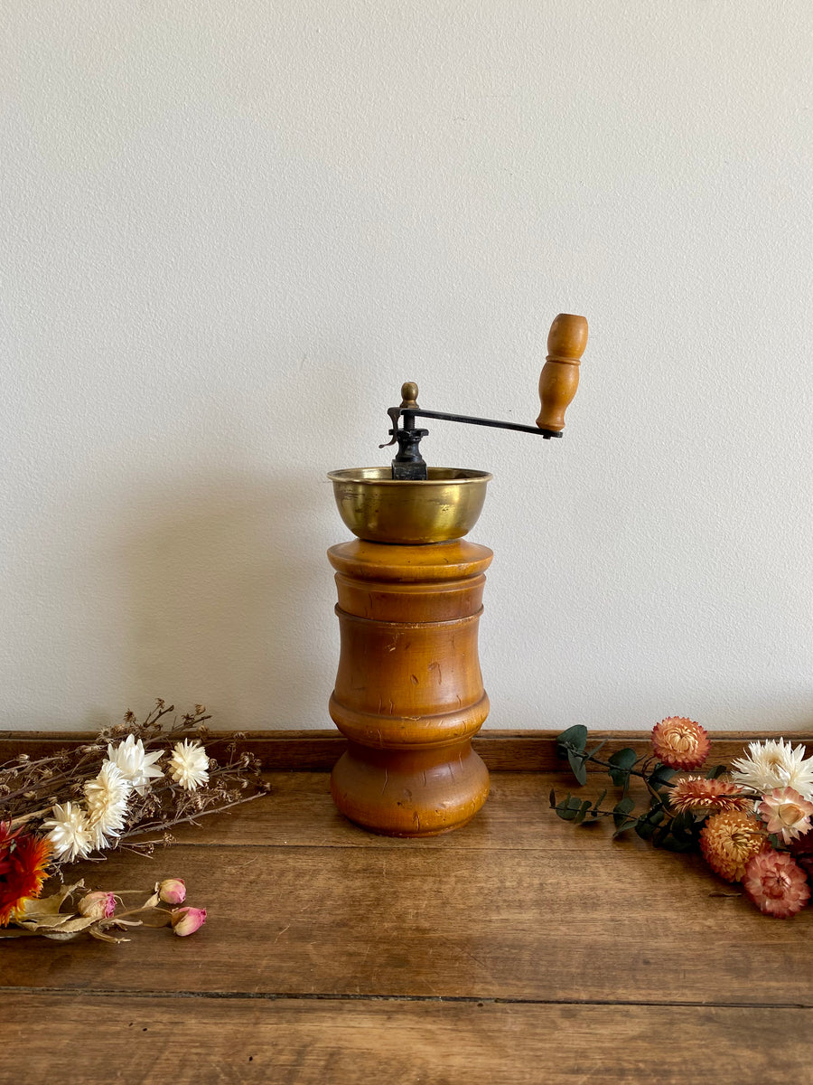 Joli moulin à café ancien de forme ronde avec son receptacle en laiton.