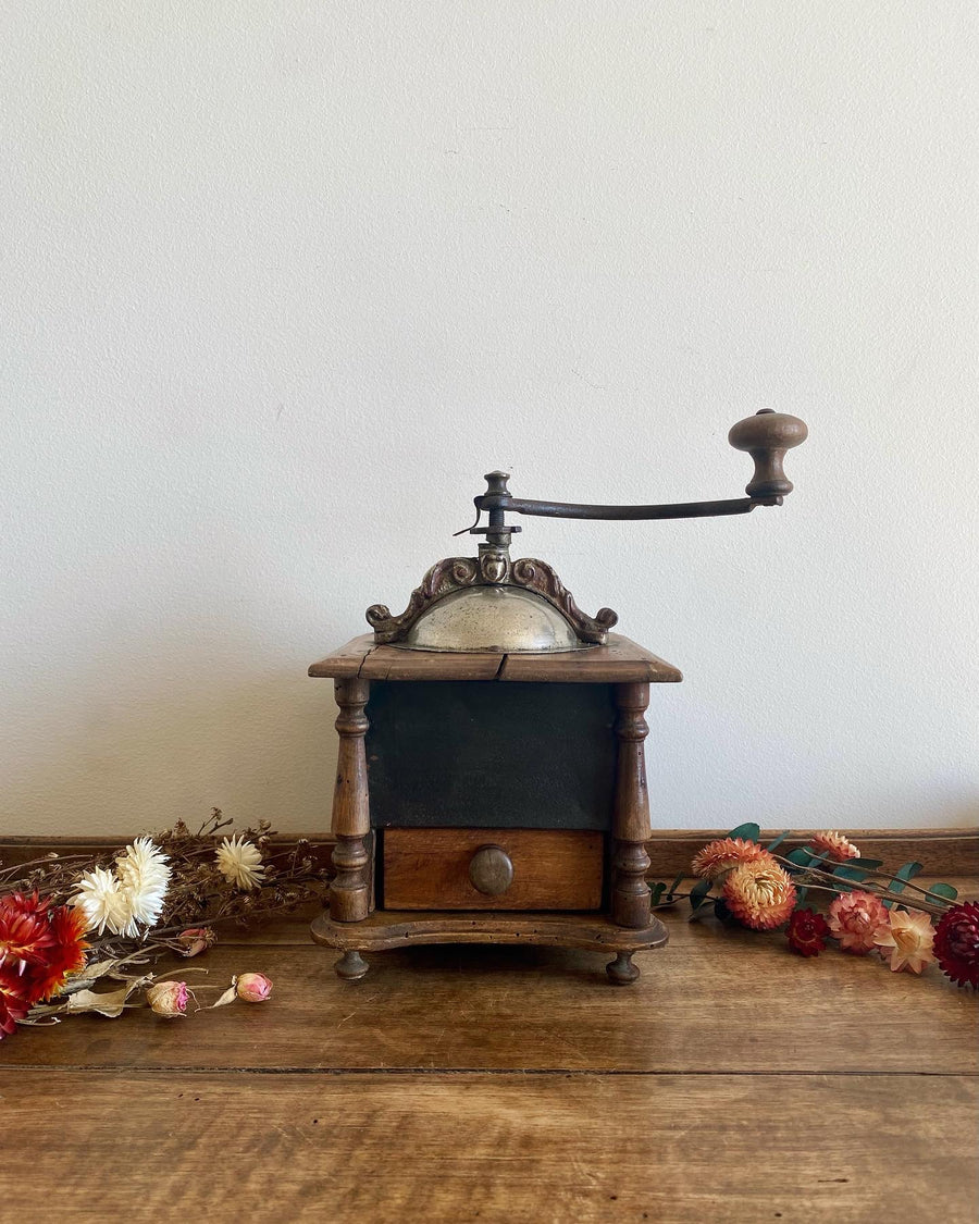 Ancien moulin à café plein de charme avec ses colonnes en bois sculptées et ses panneaux en métal laqués noirs, doté de quatre petits pieds.