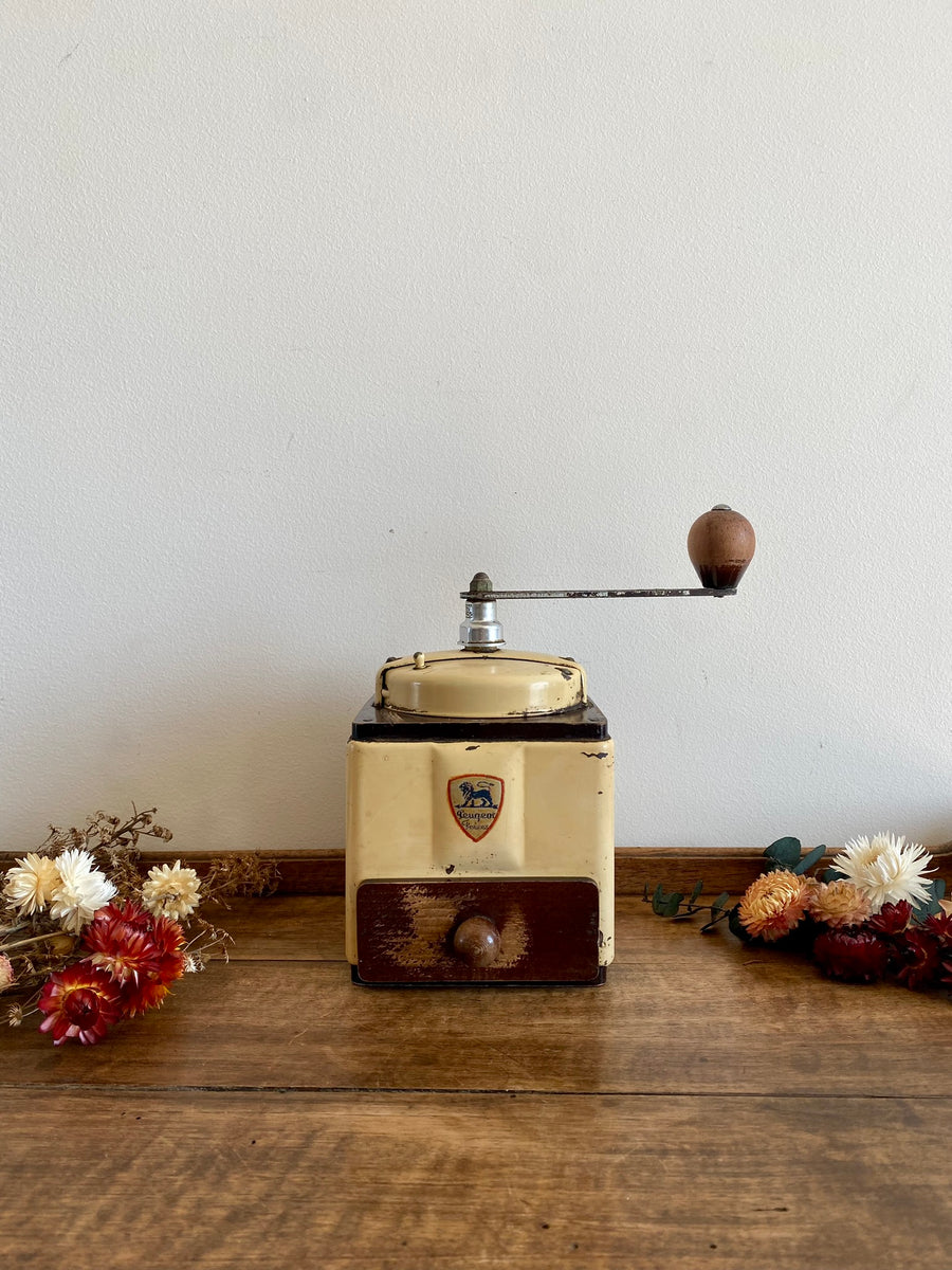 Adorable moulin à café en bois et métal beige. Peugeot frères.