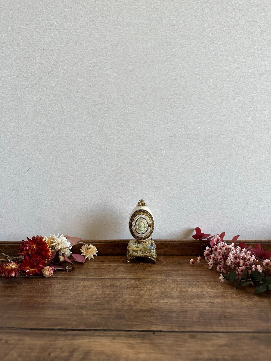 Alerte mignonnerie kitsche avec cette petite boite à musique en forme d'oeuf style fabergé serti de petites perles nacrées. Activez la manivelle et vous entendrez la douce mélodie désuète de notre enfance.